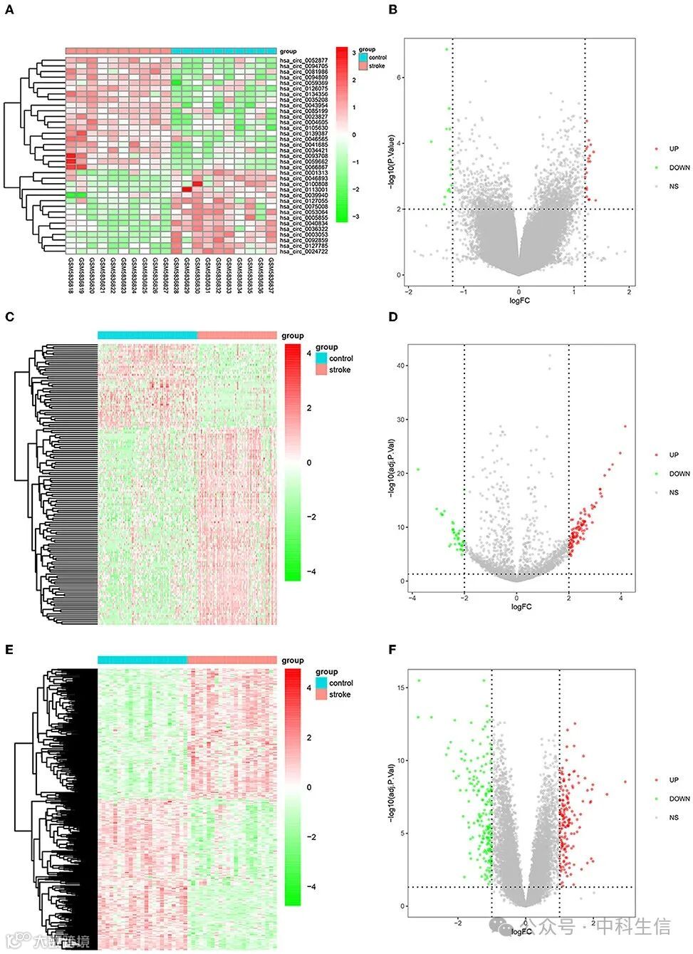 从基因表达综合 (GEO) 数据库 (https://www.ncbi.nlm.nih.gov/geo/) 下载微阵列数据集(GSE195442、GSE117064 和 GSE58294)。数据集GSE195442基于GPL31275安捷伦085499_SBC人 ceRNA 微阵列。GSE195442中的所有样本都包含在我们的研究中,包含来自 10 名 IS 患者和 10 名对照者的血浆外泌体样本。数据集GSE117064基于GPL21263 3D-Gene Human miRNA V21_1.0.0。它包含 1785 份血清样本,其中 189 名男性参与者是从 >65 岁的个体中收集的,包括 84 名 IS 患者和 105 名对照,并被纳入我们的研究。数据集GSE58294基于 GPL570 [HG-U133_Plus_2] Affymetrix 人类基因组 U133 Plus 2.0 阵列。我们的研究纳入了 23 名缺血性卒中患者(发病 5 小时)和 23 名GSE58294对照组的外周血样本。此外,基于Illumina HumanRef-8 v3.0表达芯片GPL6883 GSE16561,包含来自39名IS患者和24名对照者的外周血样本,进行了验证。本研究不需要伦理委员会的批准或知情同意,因为数据是从GEO数据库公开获得的。