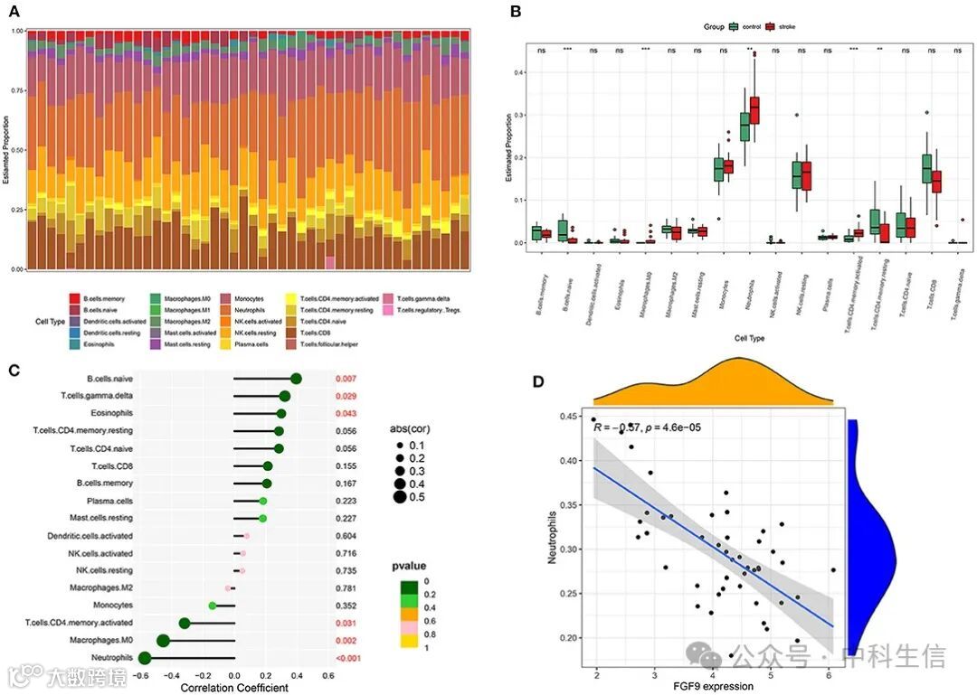 我们通过CIBERSORT分析了每个纳入的GSE58294样本中22个免疫细胞的相对表达,结果显示,纳入的样本中有17种免疫细胞表达。每个样品中免疫细胞亚型的分布如图8A所示。中性粒细胞在所有样本中均记录最高表达,IS患者的表达明显高于对照组(图8B)。此外,还分析了免疫相关枢纽基因FGF9的表达与每种免疫细胞亚型的表达的相关性。结果,FGF9的表达与中性粒细胞水平呈显著负相关(p < 0.001;图8C,D)。