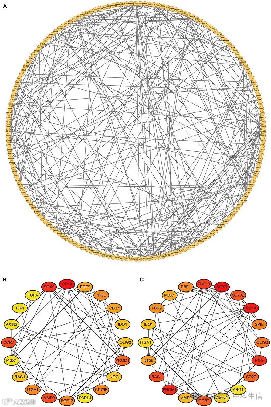 DEmRNA的PPI网络由STRING数据库构建并导入Cytoscape软件(图4A)。根据度数评分,排名前20位的基因包括CD19、CCR7、RAG1、OLIG2、ITGA1、FGF9、IDO1、AXIN2、SOX9、TGFA、CD27、NT5E、PROM1、FCRL4、TJP1、NOG、MMP9、MSX1、FGF13和CD79B(图4B)。此外,MCC评分排名前20位的基因包括CD19、CCR7、RAG1、OLIG2、ITGA1、ARG1、SPIB、FGF9、IDO1、AXIN2、SOX9、CD27、NT5E、PROM1、NOG、EBF1、MMP9、MSX1、FGF13和CD79B(图4C)。