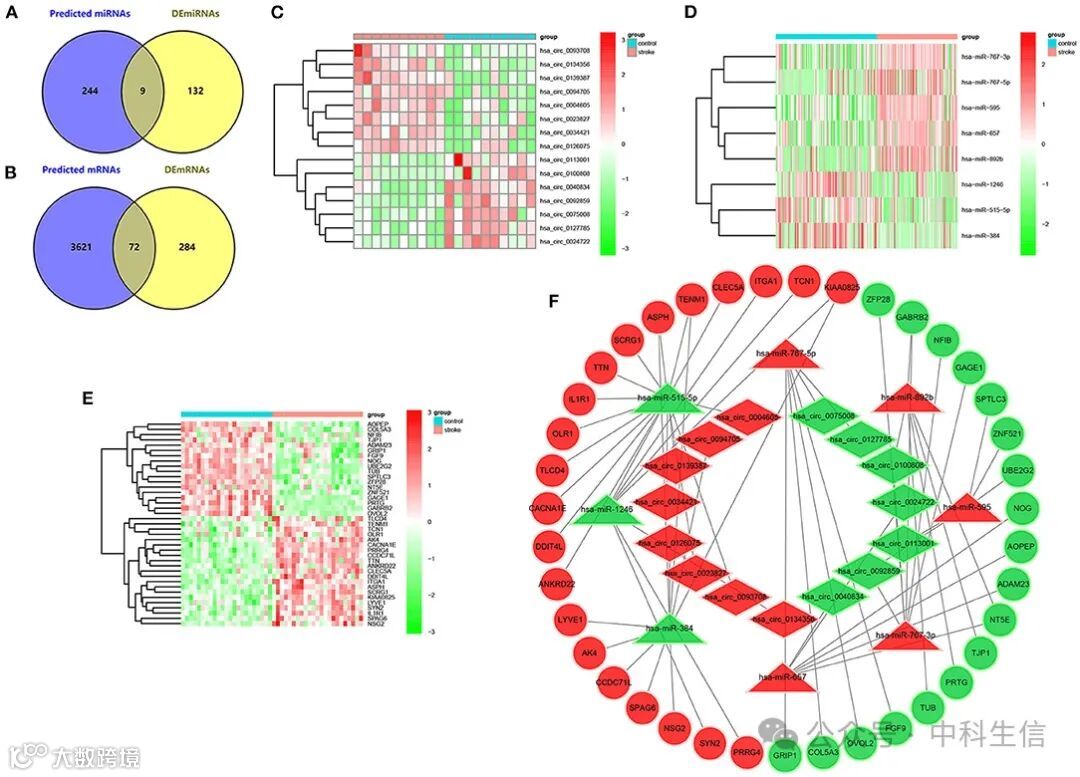 在CircInteractome数据库中共预测了253个DEcircRNAs的潜在靶标miRNA。然后,从预测的 miRNA 和 DEmiRNA 的交集处获得 9 个重叠的 miRNA(图 5A)。接下来,通过使用miRDB数据库,鉴定了3,693个重叠miRNA的潜在靶基因。随后,通过预测靶基因和DEmRNA的交叉获得了72个交叉的mRNA(图5B)。最后,基于circRNA-miRNA对和miRNA-mRNA对的负调控构建了IS的ceRNA网络,其中包括15个circRNA(图5C)、8个miRNA(图5D)和39个mRNA(图5E)。ceRNA网络如图5F所示。
