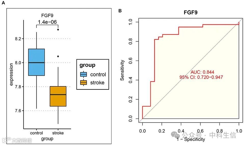 为了进一步探索IS中免疫相关的ceRNA调控关系,我们在ImmPort数据库中获得了免疫相关基因(IRG),并将IRG与ceRNA网络中的mRNA和DEmRNA的中心基因相交(图6A)。结果,重叠基因FGF9被鉴定为免疫相关枢纽基因,随后构建了IS中的免疫相关ceRNA子网。最后,hsa_circ_0127785和hsa_circ_0075008(在IS中下调)、has-miR-767-5p(在IS中上调)和FGF9(在IS中下调)形成了免疫相关的ceRNA调控网络(图6B)。在独立数据集GSE16561中,验证了 FGF9 在 IS 患者和对照中的表达(图 7A),并且 FGF9 表达与 ROC 曲线分析的 IS 诊断显着相关 (AUC = 0.844)(图 7B)。