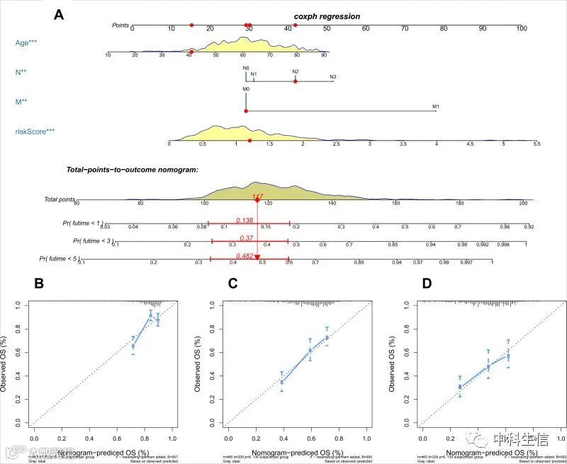 用于预测 HNSCC 患者 1 年、3 年和 5 年 OS 的列线图 (图5A );该列线图的校准曲线表明预测和实际 1、3、5 年生存分析之间的良好一致性 (图5 B-D )。