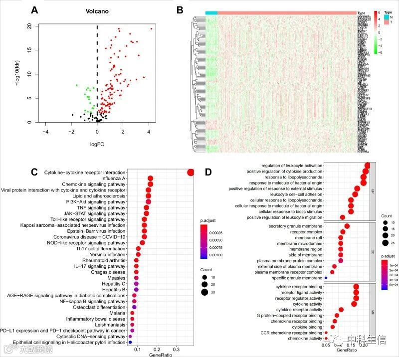 HNSCC患者DEIRGs的鉴定及功能富集分析(图1)。A和B绘制火山图和热图以显示 HNSCC 与正常样本中差异表达的基因;C和D显示功能富集分析揭示了潜在功能和富集通路。