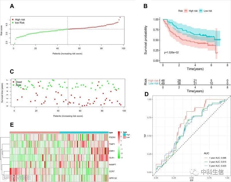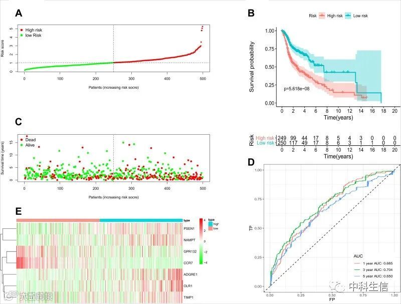 HNSCC 的 IRGS 的构建和验证(图3)。根据中位风险评分将患者分为低风险组和高风险组(A);KM生存曲线表明,高危组患者的OS明显低于低危组(B);散点图显示,高危组患者比低危组患者更易死亡且更早死亡(C);ROC曲线1年、3年、5年AUC分别为0.685、0.704、0.650,区分度好(D);两个风险组之间 7 个hub基因的不同表达水平(E)。