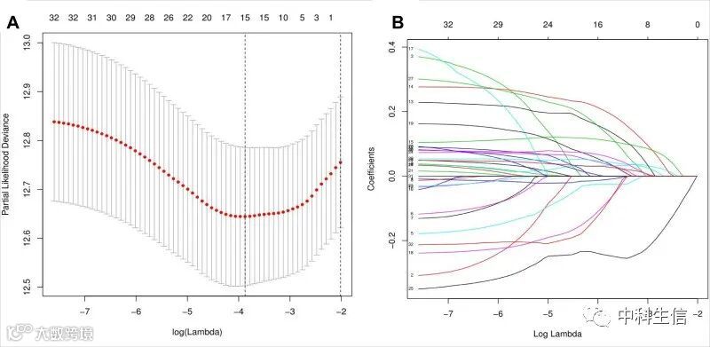 在因素Cox 分析中,32 个 DEIRG 与 HNSCC 患者的 OS 显着相关。然后,根据 LASSO 分析共选择了 15 个 DEIRG(图2A和和 B)。最后,通过执行多因素 Cox 回归,7个 DEIRG 被确定为建立 IRGS 的hub基因。