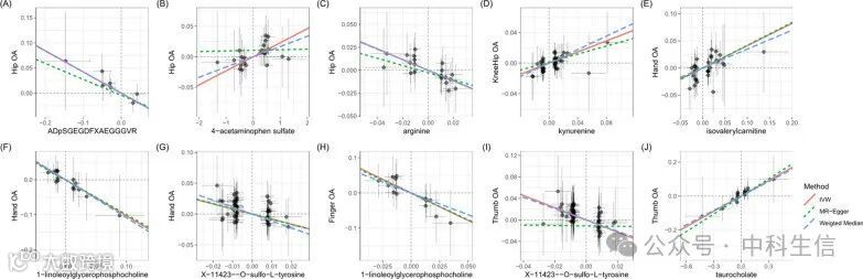 通过敏感性分析进一步评估了MR分析的可靠性。图3显示了具有显著因果关系的10对代谢物和OA表型的敏感性分析结果。一般来说,在两个额外的MR检验通常是(Weighted Median检验和MR-PRESSO检验)中观察到统计学意义(p < 0.05)时,因果关系是稳健的。10对关联中有9对被认为是稳健的,分别是1-linoleoylglycerophosphocholine与手部OA和手指OA的关联、X-11423-O-sulfo-L-酪氨酸与手部OA和拇指OA的关联、异戊酰肉碱与手部OA的关联、精氨酸与髋关节OA的关联、ADpSGEGDFXAEGGGVR*与髋关节OA的关联、犬尿氨酸与膝髋关节OA的关联、牛磺酸与拇指OA的关联(图3)。硫酸对乙酰氨基酚与髋关节OA的相关性在加权中位数检验中显示不显著(p = 0.060),但仍可将其视为潜在的因果关系,因为在IVW方法和MR-PRESSO检验中观察到其显著性(p = 1.48 × 10-4)。我们进一步通过MR-Egger和MR-PRESSO检验进一步筛选出了所有关联中可能存在的水平多效性(附加文件1:表S3)。此外,散点图(图4)和漏斗图(图5)排除了所有已确定代谢物的潜在异常值和水平多效性的可能性。敏感性和多向性分析的全部结果见附加文件1:表S4。