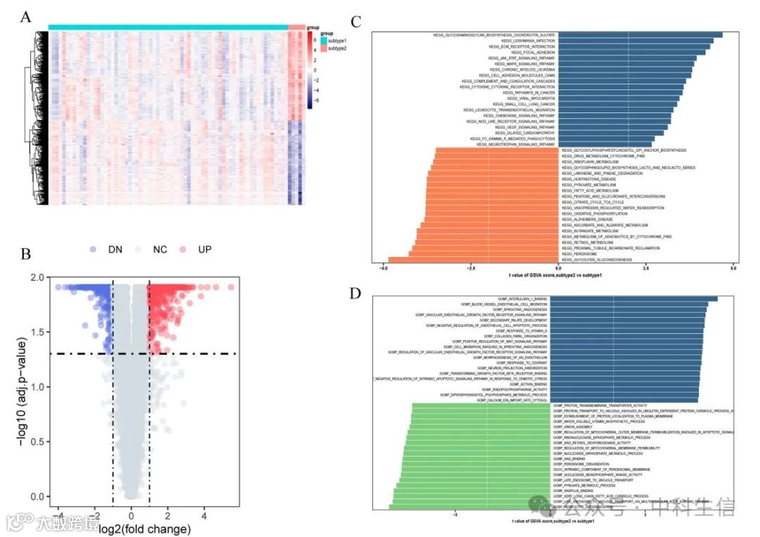(A,B)热图(A)和火山图(B)揭示了两种亚型之间的基因表达模式。(C,D)通过GSVA评分的t值排序的不同免疫微环境亚型之间的富集生物功能(C)和标志途径(D)的差异。GSVA,基因组变异分析。