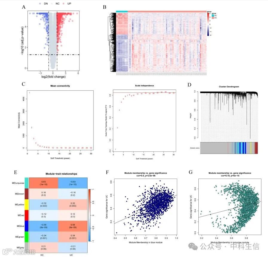 (A)火山图说明UC患者和HC之间结肠组织中的DEGs。(B)热图描绘了UC患者和HC中的基因表达谱。(C)无标度指数和平均连通度在软阈值功率确定中的应用分析。(D)基于相异性测度的模块聚类树图。(E)热图揭示了模块特征基因与UC之间的相关性。(F,G)蓝色(F)和青绿色(G)模块中UC的GS与MM的散点图。DEGs,差异表达基因;UC,溃疡性结肠炎;HC,健康对照组;TOM,拓扑重叠矩阵;GS,基因显著性;MM,模块成员。