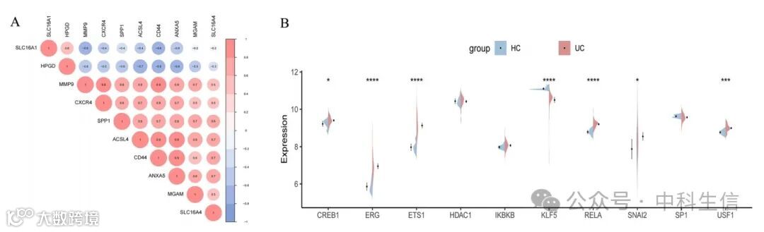 (A)sBM-DEGs的相关图。(B)显示转录因子表达水平的分割小提琴图。