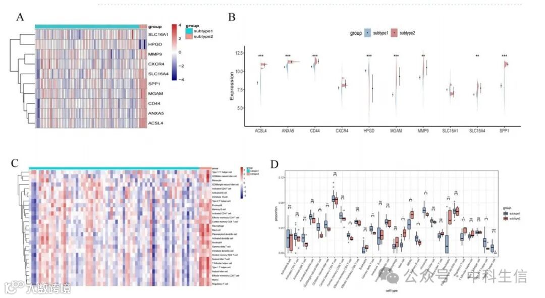 (A,B)热图(A)和分裂小提琴图(B)揭示了亚型之间10种sBM-DEGs的表达。(C)热图显示亚型之间不同的浸润免疫细胞丰度。(D)显示亚型之间免疫细胞差异的箱形图。