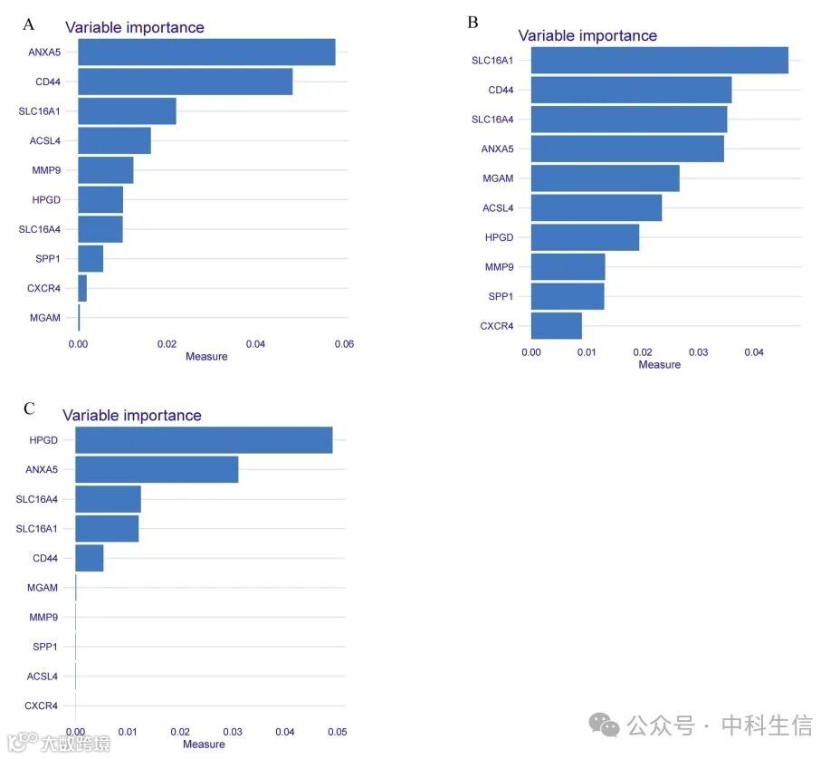 (A-C)机器学习中的变量重要性图:随机森林(A),SVM-RFE(B)和LightGBM(C)。