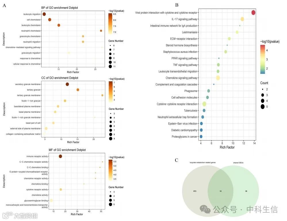 (A)共享DEGs的GO富集分析。(B)共享DEGs的KEGG途径富集分析。(C)维恩图显示丁酸盐代谢相关基因和共享DEGs之间的重叠基因。GO,基因本体论。KEGG,京都基因和基因组百科全书。
