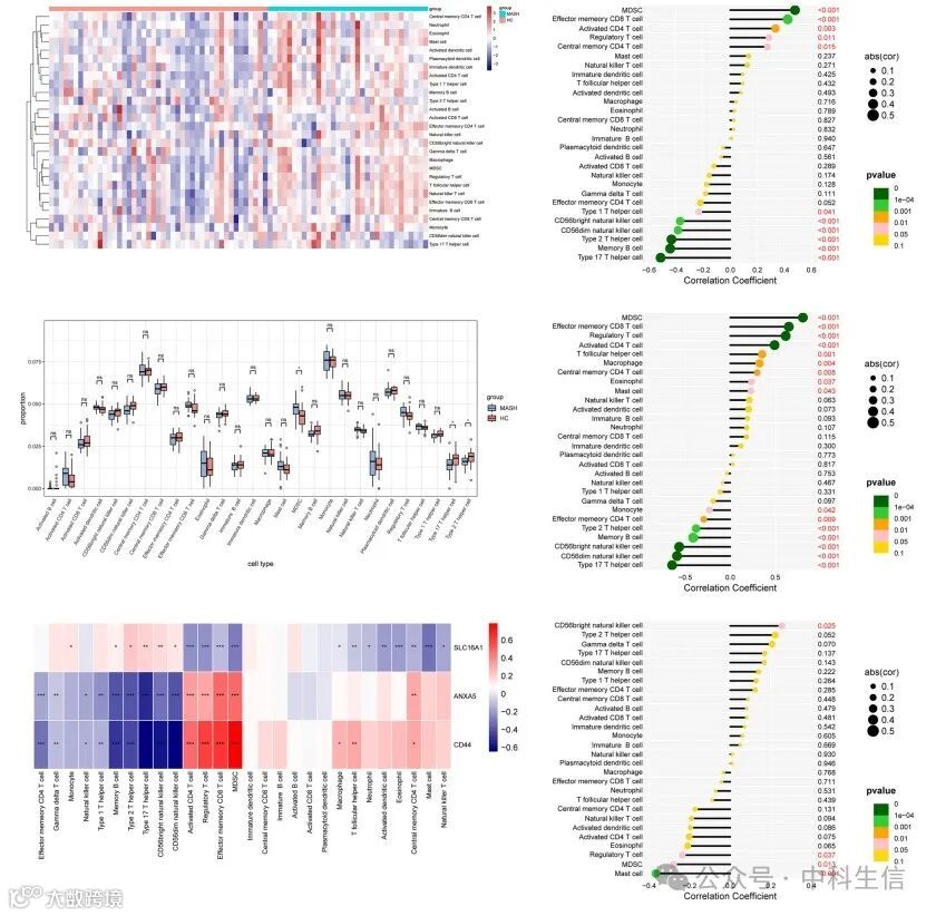 MASH患者与HC患者的免疫学特征。(A)热图描绘了MASH组和HC之间28个免疫细胞浸润的分布。(B)突出显示MASH组和HC之间浸润免疫细胞差异的箱形图。(C)说明免疫细胞浸润相关性的热图。(D-F)ANXA5(D)、CD44(E)和SLC16A1(F)与免疫浸润的相关性分析。