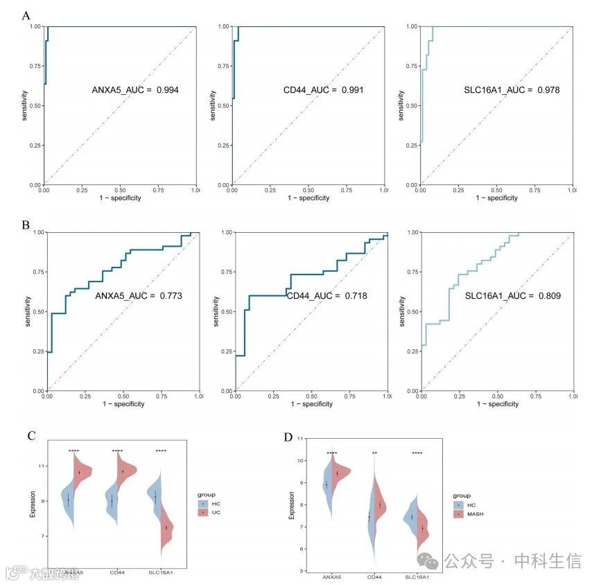 (A,B)ROC分析揭示了3种sBM-DEGs在GSE75214(A)和MASH MergeCo(B)中的诊断功效。(C,D)GSE 75214(C)和MASH MergeCo(D)中3种sBM-DEGs的表达水平。