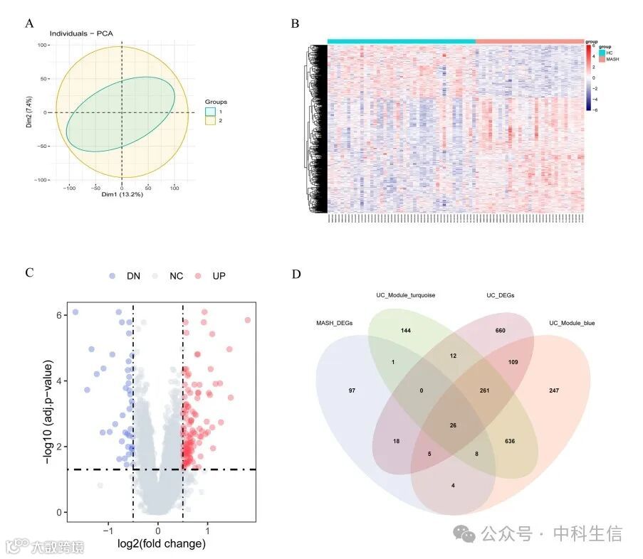 (A)批次效应校正后两个数据集的PCA。(B)热图描绘了MASH患者和HC中的基因表达谱。(C)显示MASH患者和HC之间肝组织中DEGs的火山图。(D)维恩图显示MASH-DEGs、UC-DEGs和UC相关模块之间的重叠基因-共享DEGs。