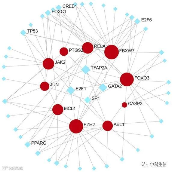 我们找到了4个度数≥5的转录因子,并构建了TFs-genes网络图(图6)。
