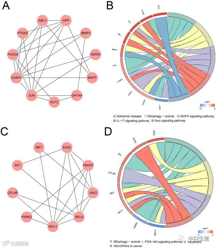 将选定的OS-DEGs导入STRING数据库构建蛋白质相互作用网络,然后使用Cytoscape创建PPI网络图谱(图4)。模块分析(图5)。( A ) PPI Network的关键模块1。( B )模块1 KEGG分析的和弦图。( C ) PPI Network 的关键模块 2。( D )模块2 KEGG分析的和弦图。