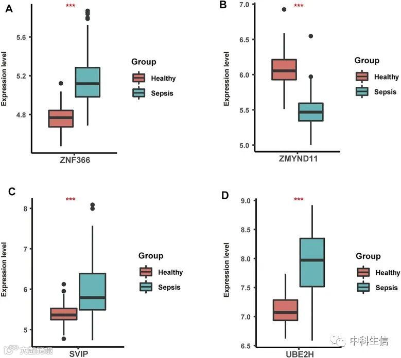 最后,由于与其他基因的联系最多,选出四个hub基因:ZNF366、ZMYND11、SVIP和UBE2H,表达情况如图6所示。