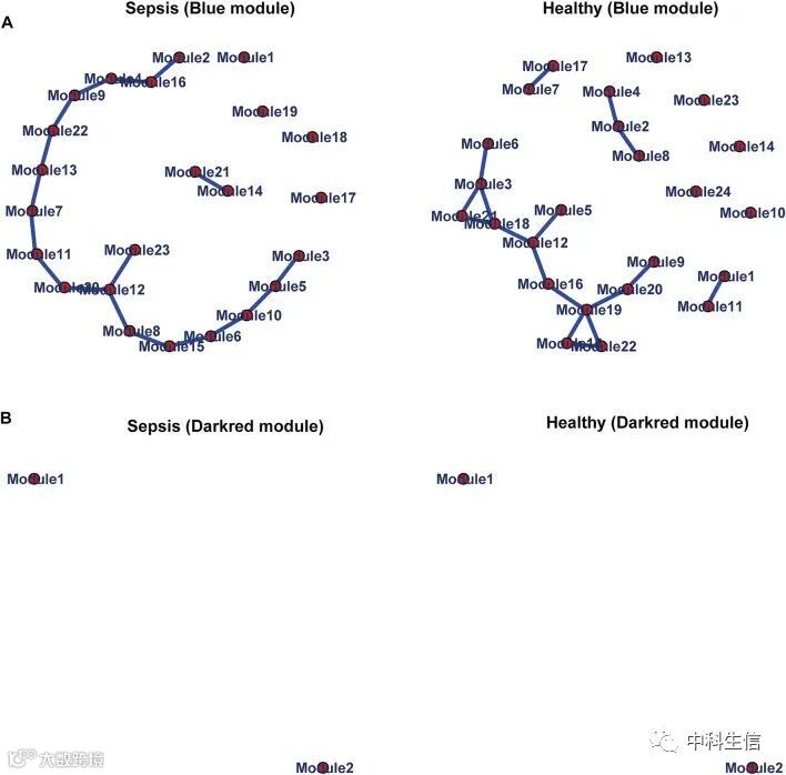 选择蓝色和深红色模块中的基因来估计差异相关性,差异相关性根据脓毒症或健康的表达模式进行分组(图4)。
