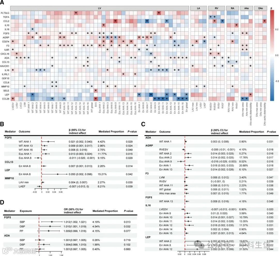 这是第一项全面评估血压、血浆蛋白、CMR特征和心力衰竭之间因果关系的研究。作者的研究结果采用了中介MR分析法,系统地研究了循环血浆蛋白对血压特征和心脏重塑之间关系的中介作用。作者的研究结果表明,包括FGF5、LEP、CCL13、MMP10、ADA、AGRP、F3和IL-16在内的几种蛋白质在介导高血压与CMR特征之间的关系中发挥了显著作用,其中LEP和FGF5的贡献尤为突出。FGF5还介导了高SBP或DBP与心衰易感性增加之间的因果关系。这些发现为了解这些复杂关系的潜在机制提供了启示。