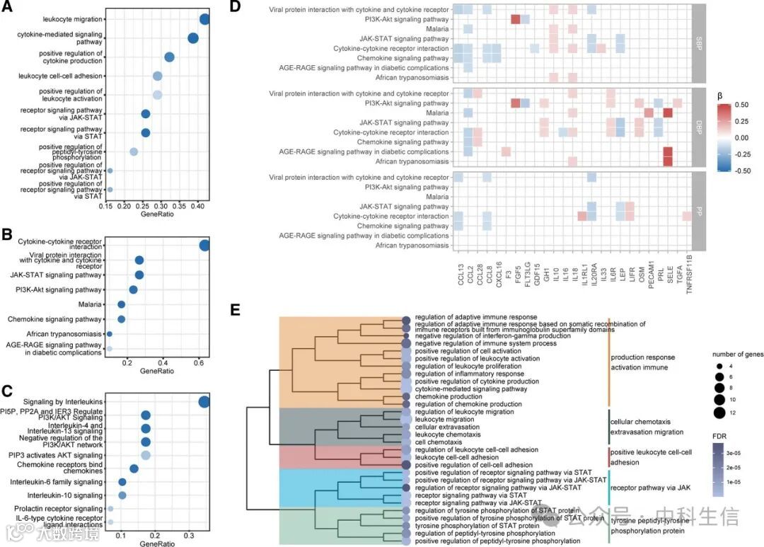 为了深入了解受血压影响的31种循环血浆蛋白的生物学意义,研究人员利用基因本体、京都基因和基因组百科全书以及Reactome数据库进行了功能富集分析。富集分析表明,这些血浆蛋白在JAK-STAT(Janus 激酶-信号转导和转录激活因子)和PI3K-AKT(磷脂酰肌醇 3 激酶-蛋白激酶 B)信号通路中明显富集(图4)。