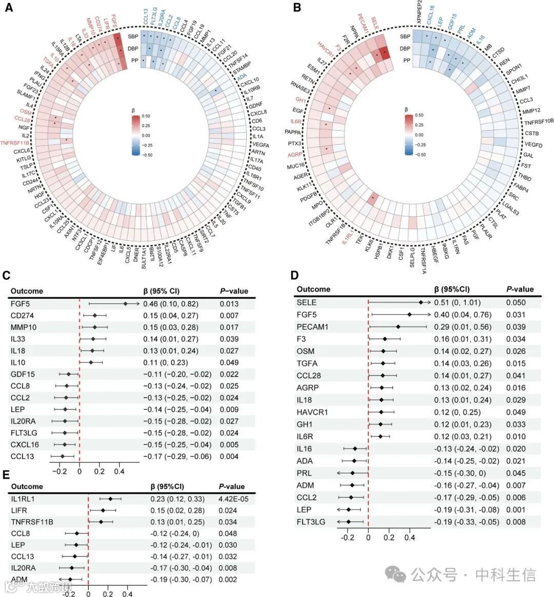 本研究利用了GWAS研究中公开的摘要级数据。与SBP、DBP或PP相关的GWAS摘要级数据来自于对75项研究的荟萃分析,这些研究涵盖了810,865名欧洲血统的个体。此外,与循环炎症蛋白和心血管蛋白相关的GWAS摘要级数据来自于对pQTL的荟萃分析。共有153种循环血浆蛋白被列为暴露因子或结果(图1B)。该荟萃分析包括11个队列,分别有14,824名欧洲血统的参与者和13个队列,分别有21,758名欧洲血统的参与者。