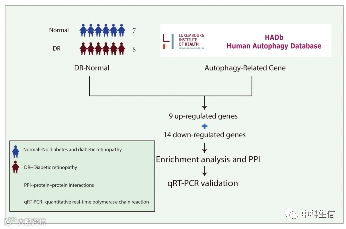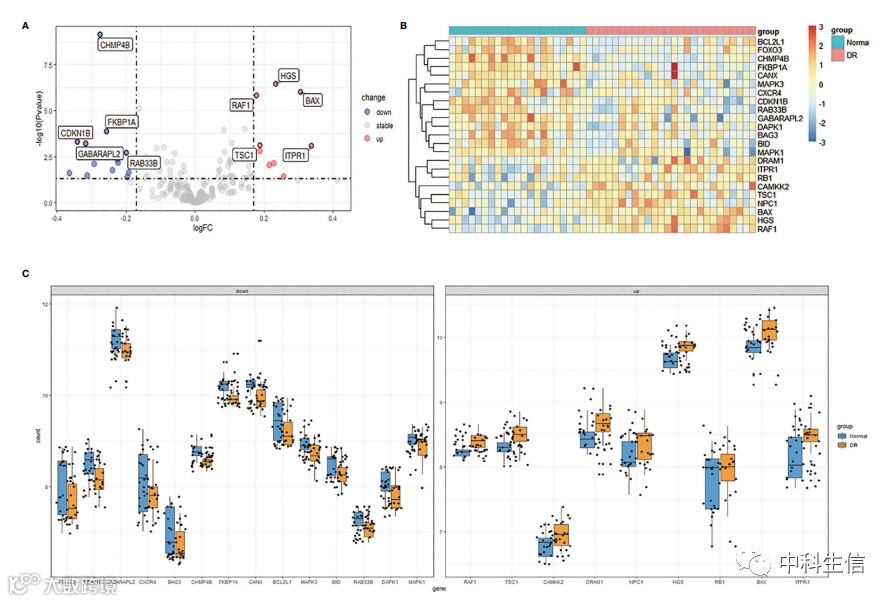 2.通过 R 软件筛选在 DR 中差异表达的自噬相关基因。