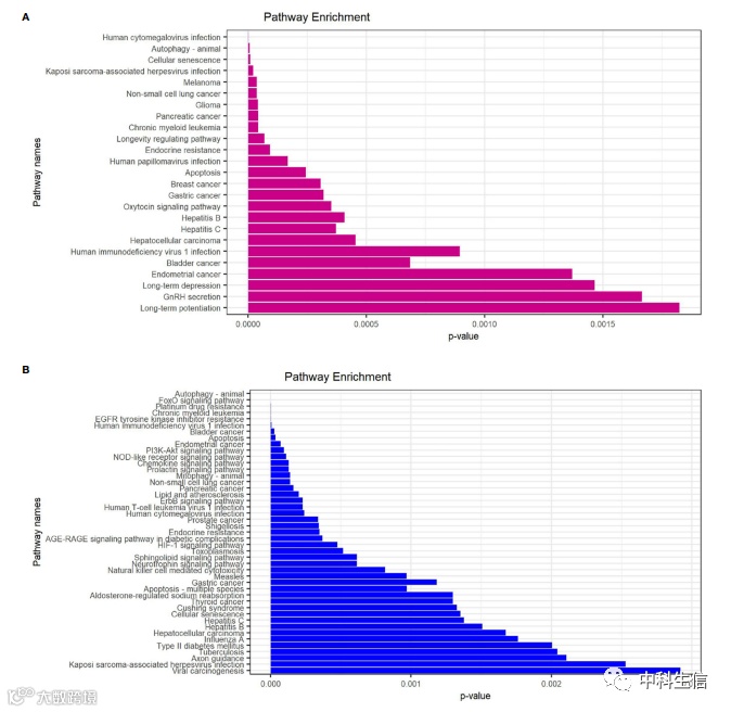 为了从生物学功能层面更深入地探索差异基因的潜在功能,使用R软件进行GO和KEGG富集分析。此外,分析了显著富集途径中差异基因的表达,并在Heatmap-like功能分类图中显示了结果。