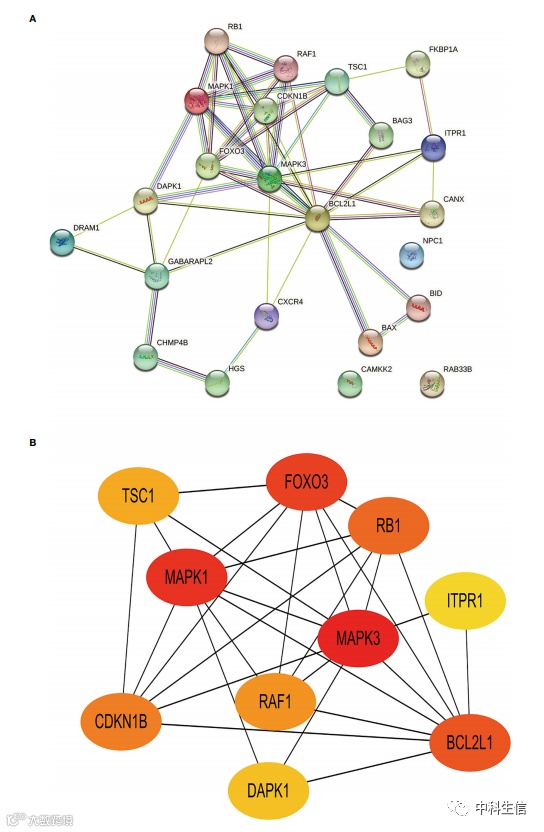 将差异表达的自噬相关基因引入到相互作用基因检索工具 (STRING) 中以构建 PPI 网络。Cytoscape筛选出前 10个最高值的 hub 基因。