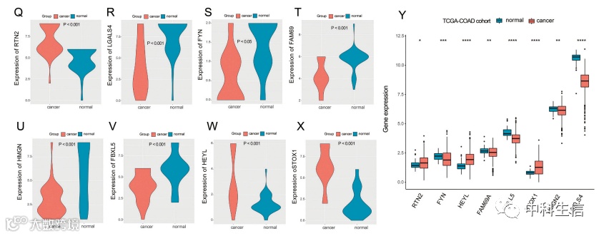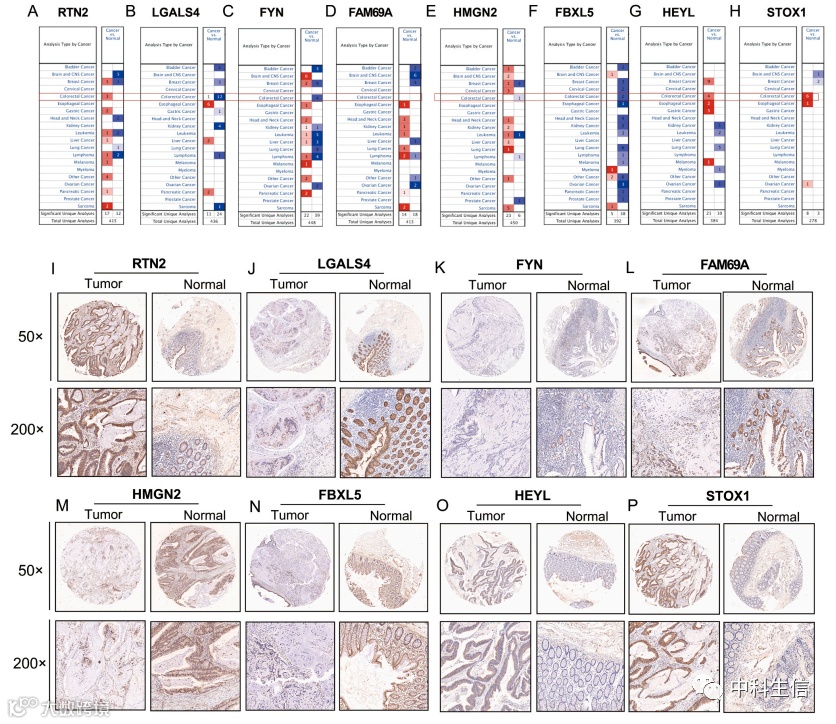 利用Oncomine数据库研究8个风险模型基因的表达水平。同时,免疫组化实验验证基因的表达情况,并在TCGA-COAD数据库中对基因表达情况进行验证。