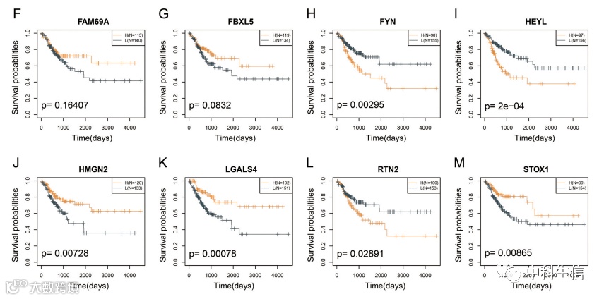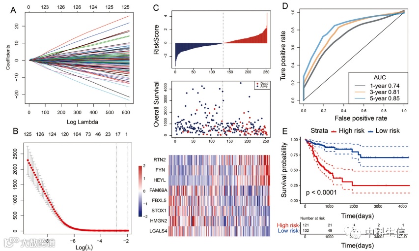 2.使用加权相关网络分析(WCGNA)识别共表达基因,并进行Lasso多变量Cox分析以建立风险预后模型;