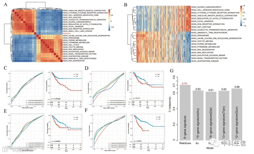 进行单样本GSVA富集分析,并进一步评估富集结果与风险评分之间的相关性。此外,将本研究得到的风险模型与其他文献得到的模型进行比较。