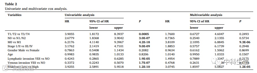 结合临床参数进行单因素和多因素cox回归分析,表明风险评分、M期和静脉侵犯是独立预后因素。