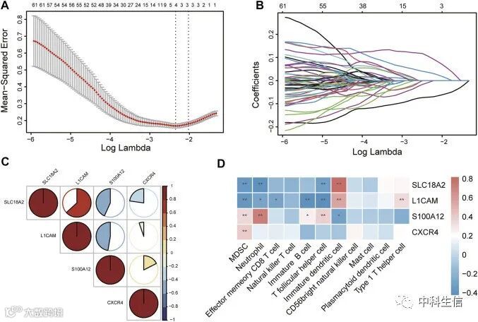 为了识别PD的免疫相关hub基因,129个免疫关键基因的表达水平和临床特征(PD与对照)被用于构建LASSO模型(图6A)。根据lambda最小标准的值,选出四个免疫相关hub基因:SLC18A2、L1CAM、S100A12和CXCR4(图6B)。免疫相关hub基因之间的关系如图6C。还评估了4个免疫相关hub基因和11种差异免疫细胞类型之间的相关性(图6D)。