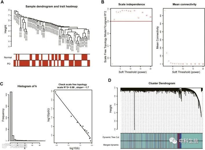 1、WGCNA分析鉴定与临床特征(PD)相关的模块基因;