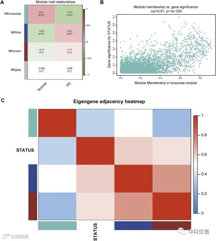 根据模块的ME值,计算这些模块与临床特征(PD vs. control)之间的相关性。turquoise模块显示与PD的相关性最高,被选为关键模块(图3A)。 MM和GS之间的关系在关键模块中进行了评估(图3B)。图3C表明turquoise模块与临床特征状态高度相关。
