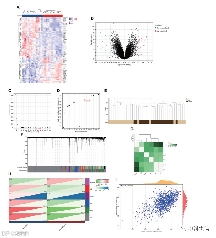 在 MS 中通过Limma鉴定 DEG ,通过WGCNA 鉴定模块基因(图2)。(A)热图显示从 MS 数据集中识别的前 50 个上调和下调的 DEG。(B)火山图显示所有 DEG,其中红色和绿色三角形表示重要的 DEG。(C, D)选择β=18作为软阈值,结合尺度独立性和平均连通性分析。(E) MS 和对照样品的聚类树状图。(F)不同颜色表示的基因共表达模块。(G)基因邻接的热图。(H)模块与 MS 之间关联的热图。(I) 绿色模块基因与 MS 最显着相关。