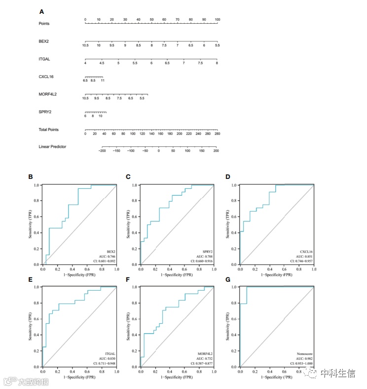 列线图构建和诊断价值评估(图5)。(A) 列线图是基于五个候选hub基因构建的。(B-G)每个候选基因(BEX2、SPRY2、CXCL16、ITGAL和MORF4L2)的 ROC 曲线显示所有候选基因对AVC合并MS均具有较高的诊断价值。