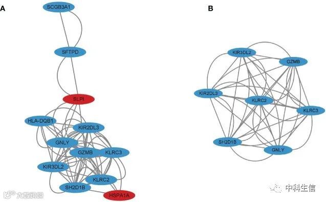 Hub基因的鉴定(图4)。(A) 12 个免疫差异表达基因 (DEG) 的蛋白质-蛋白质相互作用 (PPI) 网络,红色标记的上调基因和蓝色标记的下调基因。(B)使用 MCODE 构建由七个基因组成的簇1。