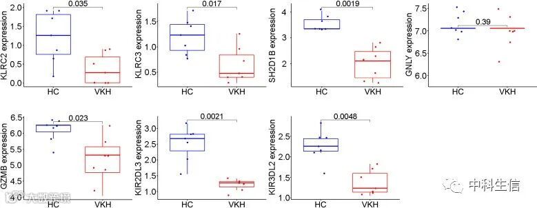在基因表达水平验证免疫潜在中枢基因(图5)。Vogt-Koyanagi-Harada 患者 (VKH) 中 KLRC2、KLRC3、SH2D1B、GZMB、KIR2DL3 和 KIR3DL2 的表达明显低于健康对照组 (HC)。GNLY的表达水平在两组间无统计学差异。