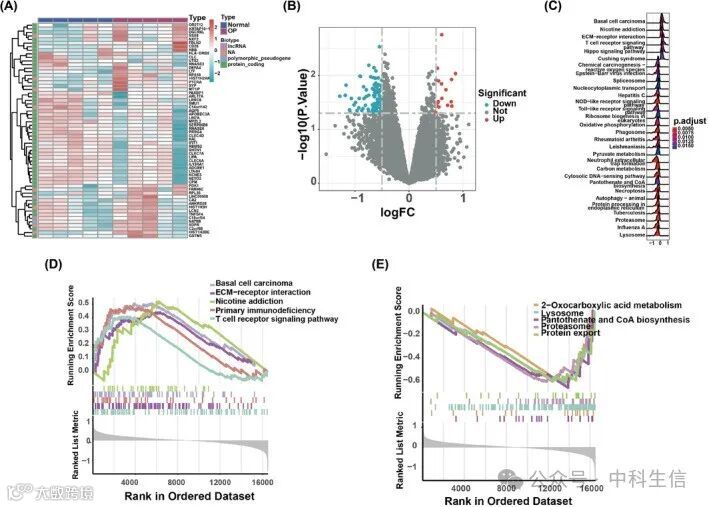 通过分析5个正常样本和5个OP样本的差异表达谱,确定了一组与OP相关的60个mRNA(图 2A,B)。富集分析表明,这些mRNA参与了多种生物学功能。与OP相关的三个主要BP是“基底细胞癌”、“尼古丁成瘾”和“ECM-受体相互作用”(图 2C)。与上调的差异表达mRNA相关的BP包括“基底细胞癌”、“ECM-受体相互作用”、“尼古丁成瘾”、“原发性免疫缺陷”和“T细胞受体信号通路”(图 2D)。相反,下调的差异表达mRNA则富集于“2-氧代羧酸代谢”、“溶酶体”、“泛酸和CoA生物合成”、“蛋白酶体”和“蛋白质输出”(图 2E)。