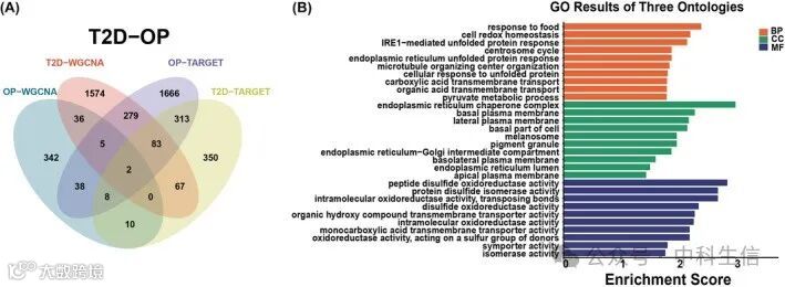 利用MCODE和TARGET分析提取了四个基因群。在这些聚类中,发现两个基因(PDIA6和SLC16A1)在T2D和OP之间重叠;这两个基因组成了一个基因组,称为基因组2(GS2)(图 5A)。为了研究这些DEGs之间的潜在功能联系,DEGs主要涉及“对食物的反应”、“内质网伴侣复合体”和“肽二硫化物氧化还原酶活性”等过程(图 5B)。