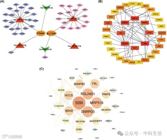 基于GEO数据库,我们获得了这些共有miRNA在疾病中的表达数据。结果显示,在T2D中,18个miRNA表达上调,21个miRNA表达下调。在OP中,183个miRNA表达上调,86个miRNA表达下调。值得注意的是,有6个miRNA在T2D和OP中重叠:hsa-miR-181c-5p、hsa-miR-29b-3p、hsa-miR-150-5p和hsa-miR-5003-3p。在T2D中,miRNA靶向了833个mRNA,而在OP中,iRNA靶向了2394个mRNA。在6个重叠的miRNAs中,PDIA6和SLC16A1这两个基因是靶标。因此,我们构建了一个由6个miRNA和38个mRNA组成的全面的miRNA-mRNA网络(图 7A),以及一个交互作用图来说明35个靶基因之间的关系(图 7B)。最后,建立了一个PPI网络来分析35个靶基因(图 7C)。