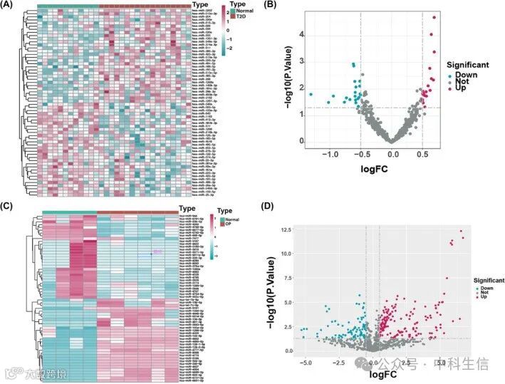 通过评估正常样本和T2D样本之间的差异表达谱,发现60个miRNA与T2D相关(图 6A、B)。同样,通过分析正常样本和OP样本之间的差异表达谱,确定了与OP相关的60个miRNA(图 6C、D)。