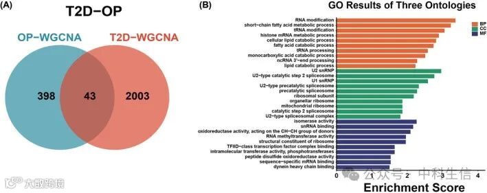 共有43个基因在与T2D和OP正相关的模块中重叠,被定义为基因组1(GS1)(图 4A)。这些基因与这两种疾病的发病机制密切相关。为了进一步研究GS1 的潜在功能,我们进行了GO富集分析。分析表明,GO BP、CC 和MF的前三位显着富集词分别是“RNA修饰”、“U2snRNP”和“异构酶活性”(图 4B)。这一发现证实了这些成分在T2D和OP中的重要参与。