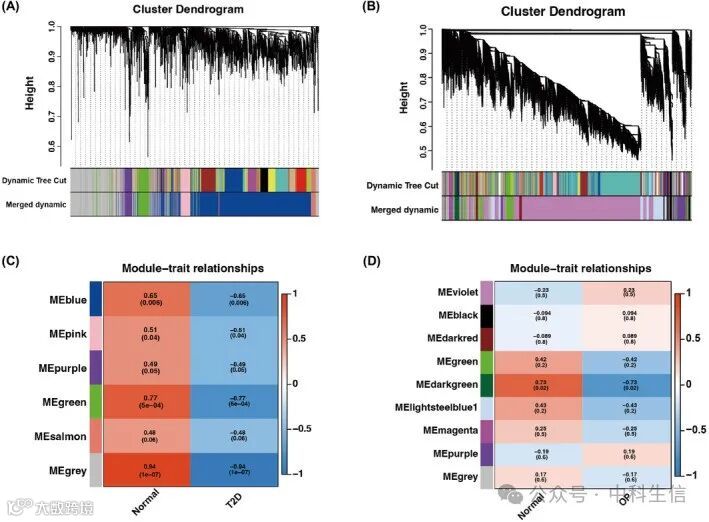 随着基因芯片技术的发展,研究人员可以快速检测与各种疾病相关的多个基因的表达数据。加权基因共表达网络分析(Weighted gene coexpression network analysis ,WGCNA)是一种流行的生物信息学方法,可有效分析基因与表型之间复杂的相互作用。WGCNA可将基因组织成共同表达模块,从而建立样本特征与基因表达变化之间的关键关系。我们试图利用WGCNA找出基因簇,包括OP和T2D之间存在相关性和联系的共有基因。这种方法已在多种生物情况下进行了有效测试,可识别与各种疾病表型相关的共同风险基因和通路。