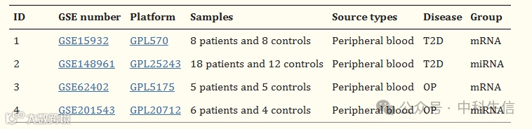 今天小编和大家分享一篇24年发表在JOURNAL OF CELLULAR AND MOLECULAR MEDICINE(IF:5.3)杂志的文章《Exploration of shared gene signatures and molecular mechanisms between type 2 diabetes and osteoporosis》。作者通过GEO数据库分析2型糖尿病和骨质疏松发病机制中的关键基因,从而确定可能治疗2型糖尿病和骨质疏松共同发病的患者的潜在治疗靶点。
