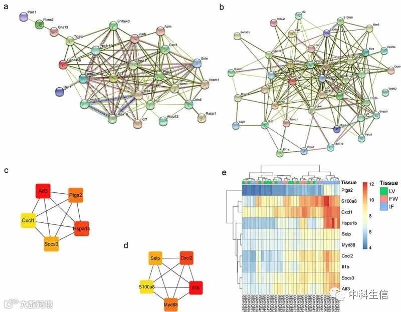 绿色模块26个关键基因之间有118个相互作用(图6a),黄色模块40个关键基因中有39个有197个相互作用(图6b)。使用cytohubba在两个PPI网络中发现了5个hub基因(图6c,d)。这些hub基因的表达水平在心肌梗死区域升高(图6e)。