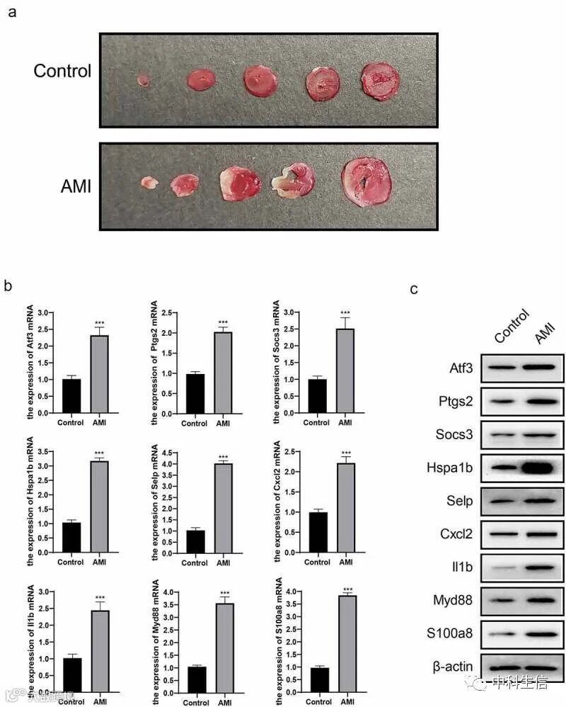 成功建立了AMI小鼠模型(图9a)。与对照组相比,AMI小鼠心肌组织中Atf3、Ptgs2、Socs3、Hspa1b、Selp、Cxcl2、Il1b、Myd88、S100a8的相对mRNA表达水平显着上调(图9b);同时,蛋白质表达水平也显着增加(图9c)。结果与GSE4648和GSE775的表达数据一致。