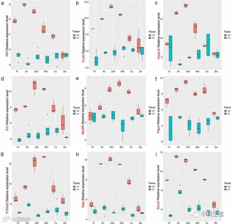 用GSE775检查了10个hub基因的表达水平(图7)。未检测到Cxcl1,其他9个基因的表达与在GSE4648中的表达一致。